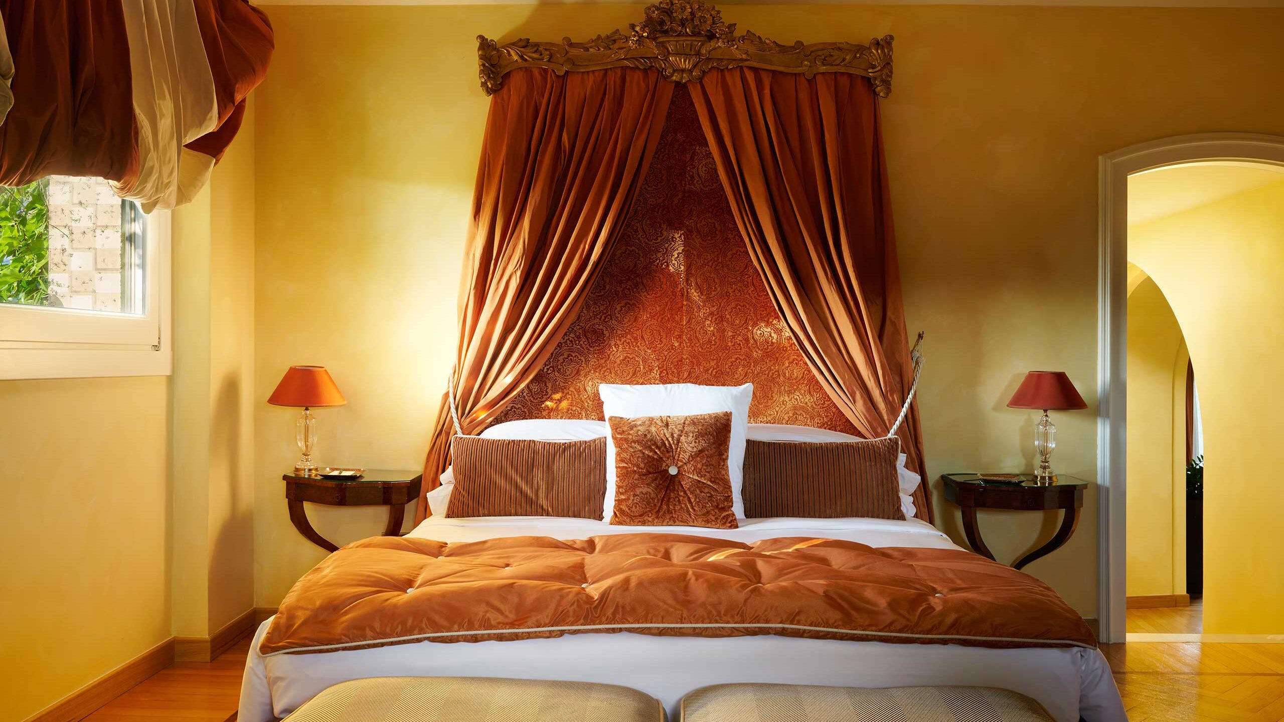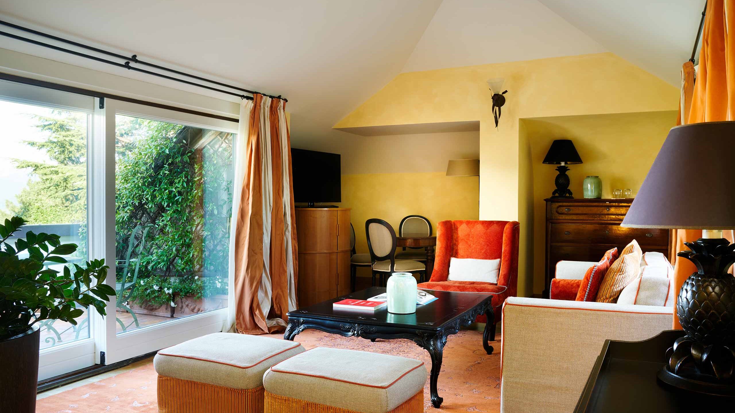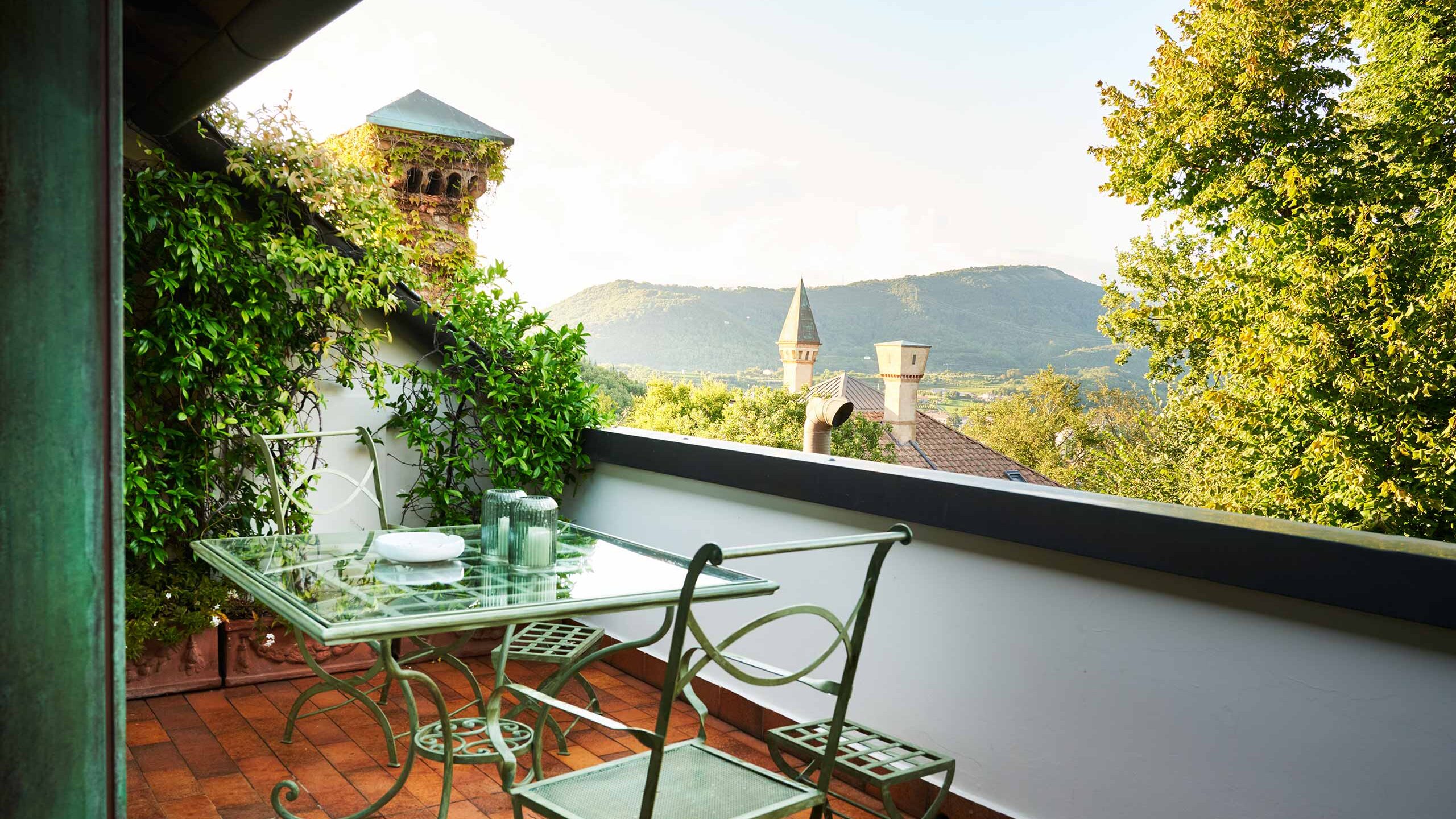 Unique and exclusive, located on the top floor of the Torre Bellavista tower, the Suite includes a large living room, a spacious bedroom, two separate bathrooms, a cosy balcony and a private terrace with breathtaking views of Franciacorta and its vineyards. Furnished with fine period furniture and exquisite fabrics, the Torre Bellavista Suite stands out for its sophisticated and timeless atmosphere.