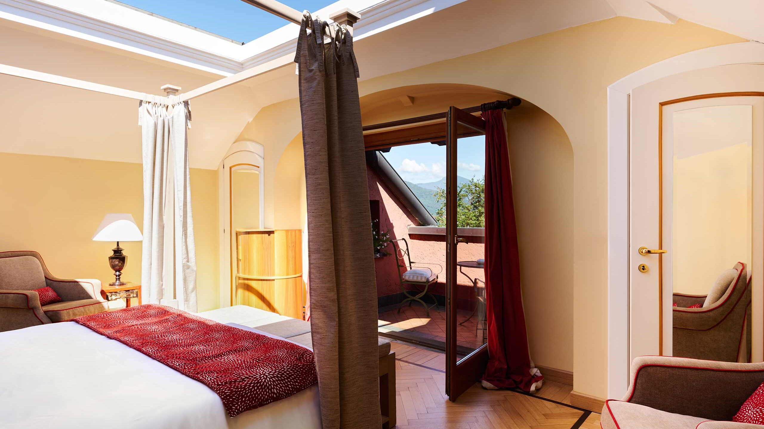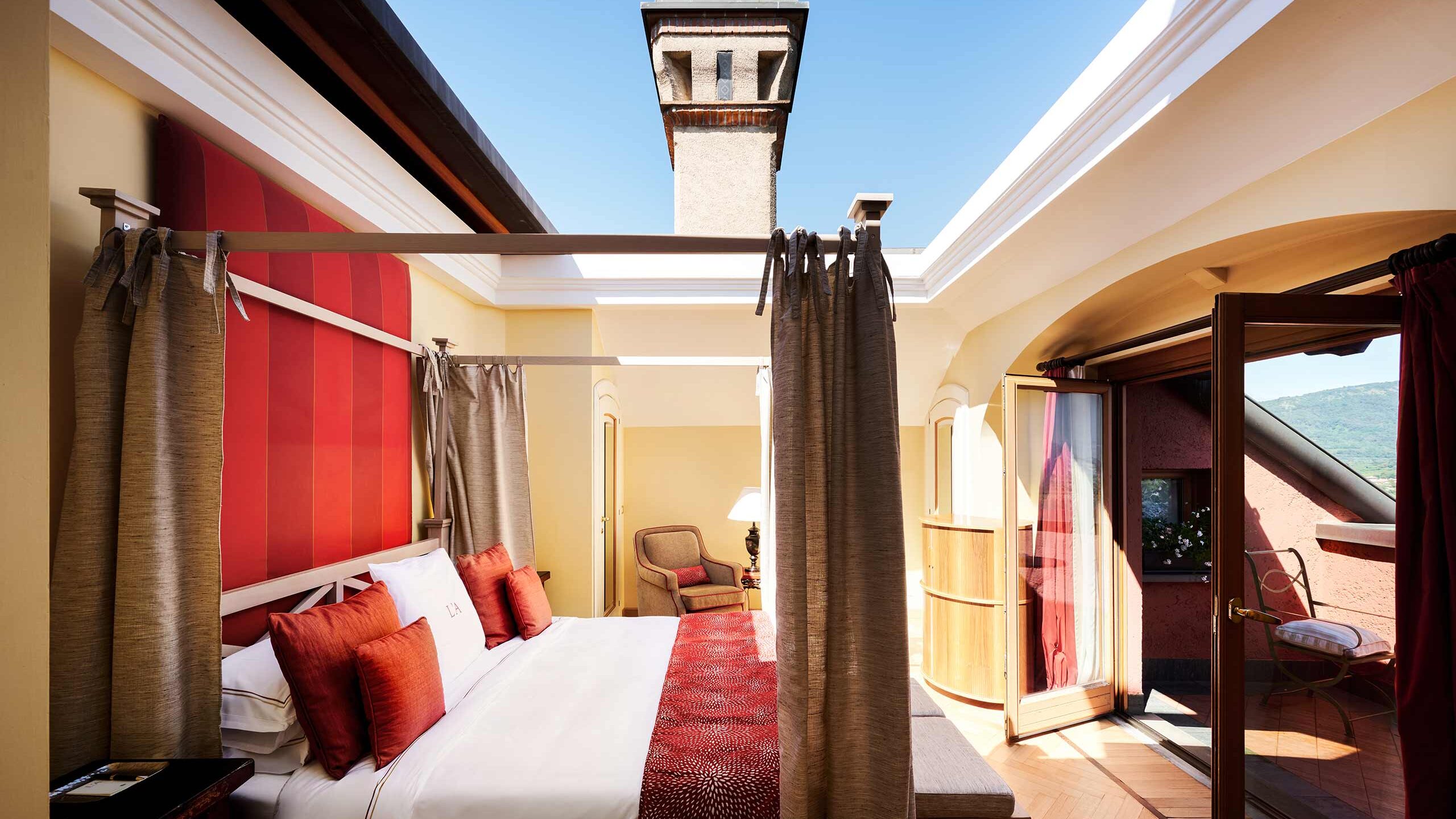 La Cabriolet Suite de L'Albereta Relais & Chateaux riserva una romantica sorpresa: basta premere un bottone e, quasi per incanto, il soffitto sopra al letto a baldacchino si apre sul cielo sellato.