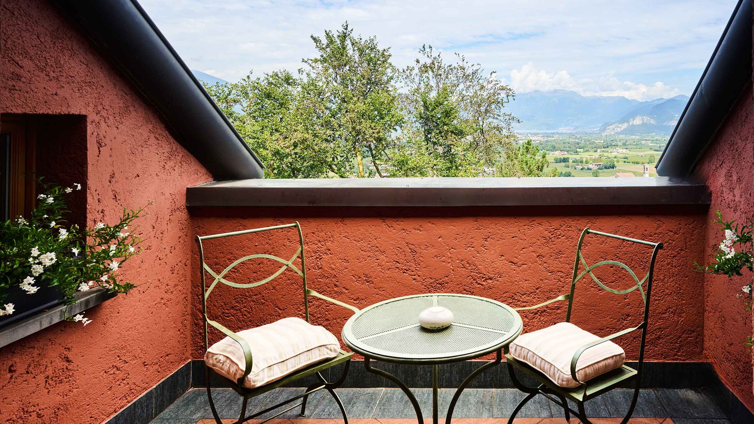 Intima e accogliente, la camera dispone anche di un balcone privato, che affaccia sui vigneti circostanti e sul lago d’Iseo.